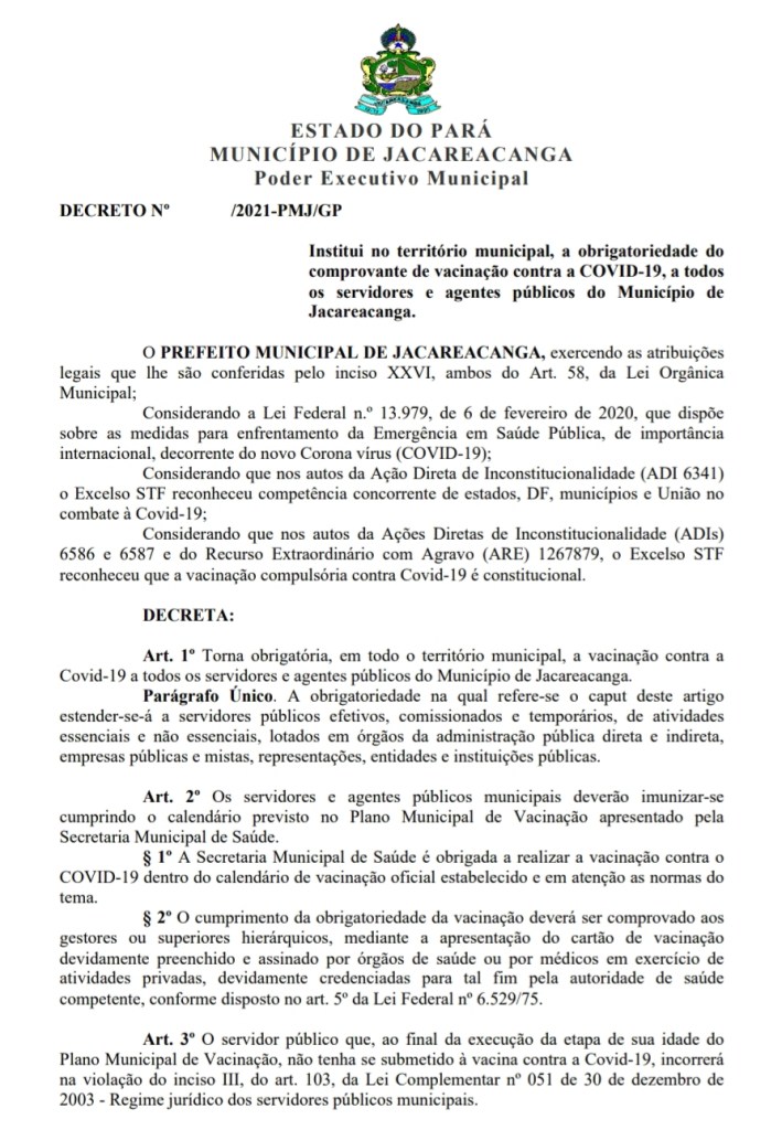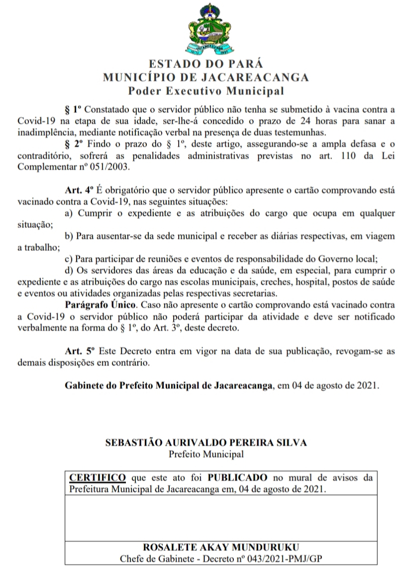 Na cidade onde eu moro, Jacareacanga no Estado do Pará, não foi diferente. O Prefeito Municipal emitiu o seguinte Decreto Municipal:
